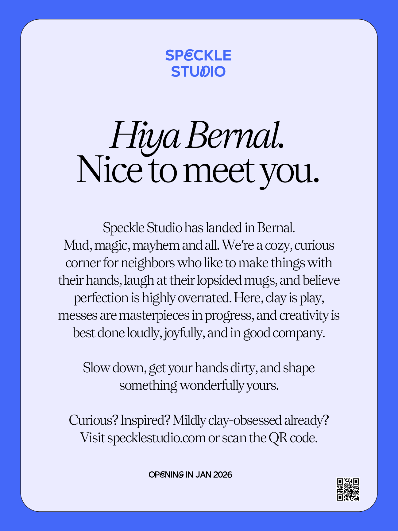 Formally Pinckney Clay Studio, we are now Speckle Studio! We offer youth and adult classes in 2D and Clay. We moved to 416 Cortland Ave and we are almost ready! Sign up for our email list to know when classes are released.